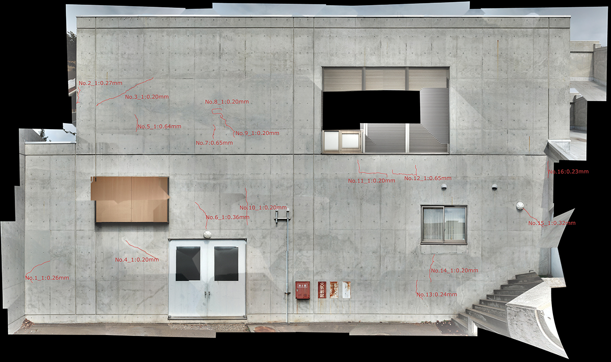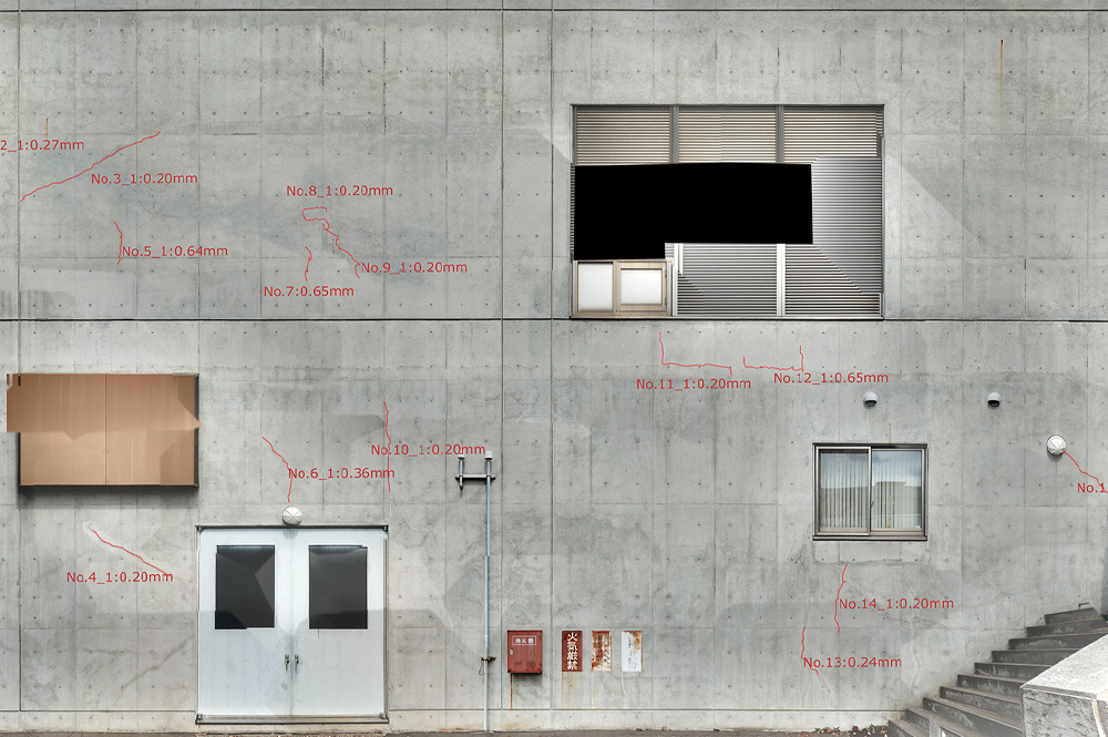 コンクリート構造物・コンクリート壁面などの表面クラックを可視画像からのAI判定にて行っております。高層建築物等でもドローンにより調査可能となります。